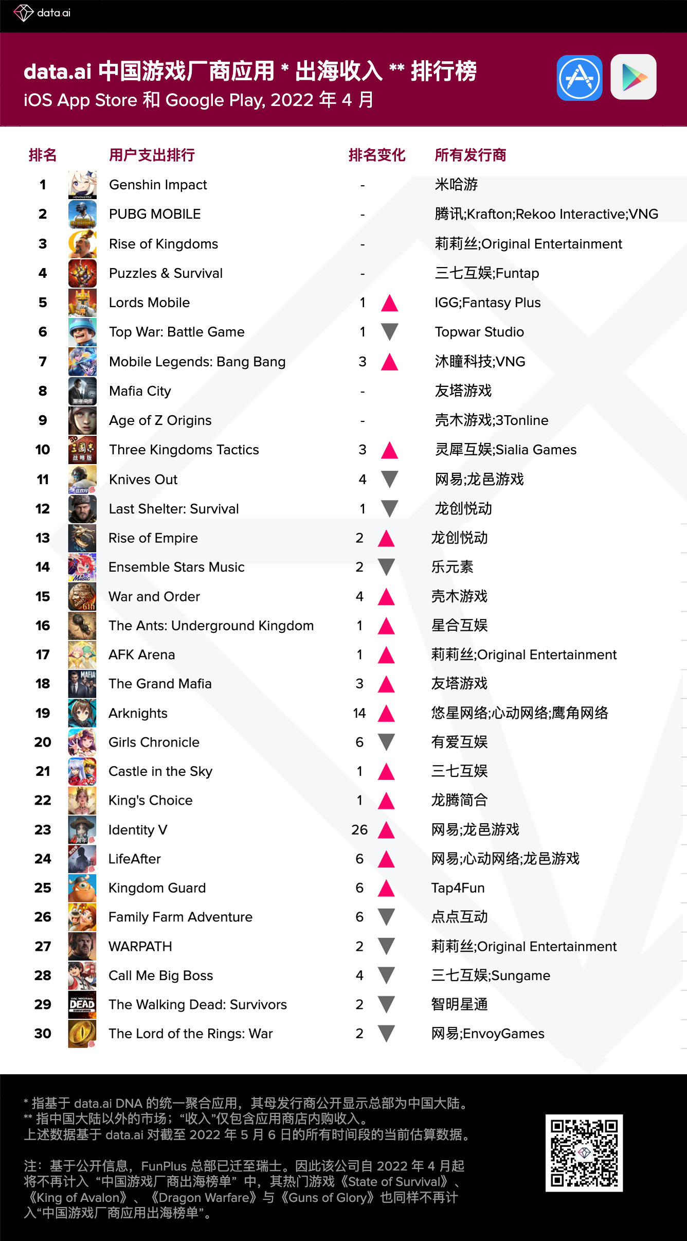 data.ai 发布了 2022 年 4 月中国游戏厂商及运用出海收入 30 强榜单。以下是陈述主要内容: