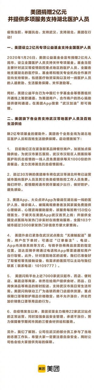 美团捐赠 2 亿元并推多项服务支持湖北医护人员与百姓
